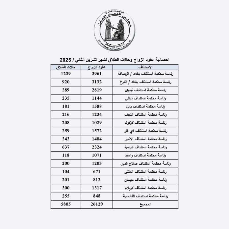 أعلن مجلس القضاء الأعلى، اليوم الأربعاء ( 17 كانون الأول 2025 )، إحصائية رسمية لعدد حالات الزواج والطلاق المسجلة في عموم العراق لشهر تشرين الثاني 2025.