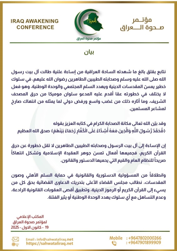 أعرب مؤتمر صحوة العراق، اليوم الجمعة ( 19 كانون الأوّل 2025 )، عن قلقه البالغ إزاء ما شهدته الساحة العراقية من إساءة علنية طالت آل بيت رسول الله صلى الله عليه وآله وصحابته الطيبين الطاهرين، معتبراً أنّ هذه السلوكيات تمسّ المقدّسات الدينية وتهدّد السلم المجتمعي والوحدة الوطنية.