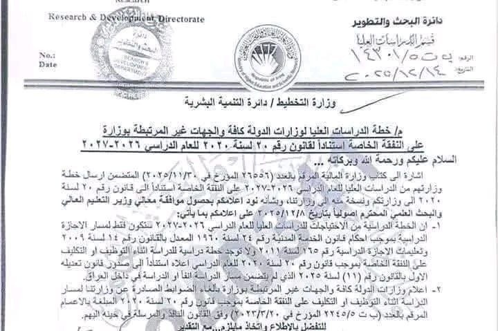 أعلنت وزارة التعليم العالي والبحث العلمي، حسم ملف خطة الدراسات العليا للعام الدراسي 2026–2027، مؤكدة اعتماد مسار واحد فقط للدراسة، استناداً إلى القوانين النافذة والتعديلات الأخيرة ذات الصلة.
