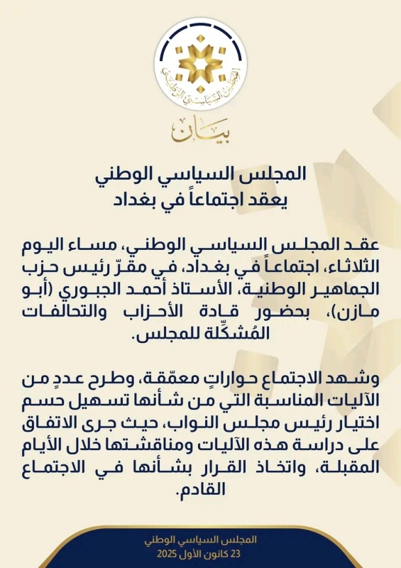 أعلن المجلس السياسي الوطني، مساء اليوم الثلاثاء ( 23 كانون الأول 2025 )، عقد اجتماع في بغداد لبحث آليات حسم ملف رئاسة مجلس النواب، بحضور قيادات الأحزاب والتحالفات المنضوية في المجلس.