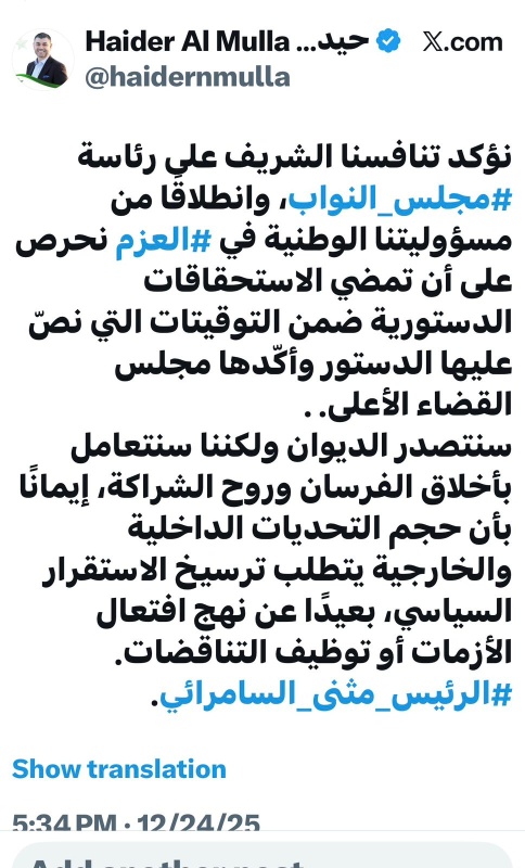 تصريحات الملا تأتي في إطار النقاشات الجارية لطرح مرشح رئاسة البرلمان، مع تأكيد التحالف على أهمية الالتزام بالدستور وتعزيز الاستقرار الوطني.