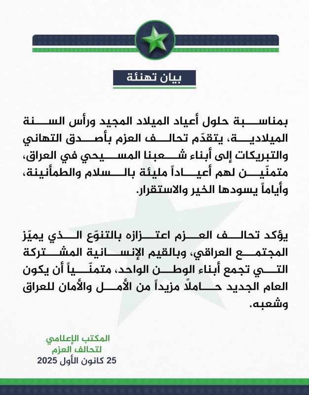 قدّم تحالف العزم، اليوم الخميس ( 25 كانون الأول 2025 )، أصدق التهاني والتبريكات إلى أبناء المكوّن المسيحي في العراق بمناسبة أعياد الميلاد المجيد ورأس السنة الميلادية، متمنيا لهم أعيادا مليئة بالسلام والطمأنينة، وأياما يسودها الخير والاستقرار.