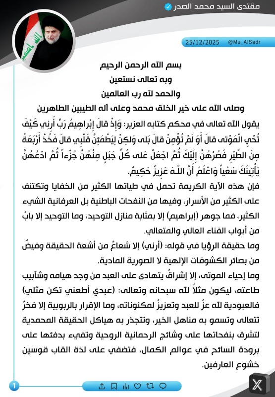 أصدر زعيم التيار الصدري، مقتدى الصدر، اليوم الخميس، ( 25 كانون الأول 2025 )، تغريدة جديدة على صفحته الرسمية بموقع "أكس".