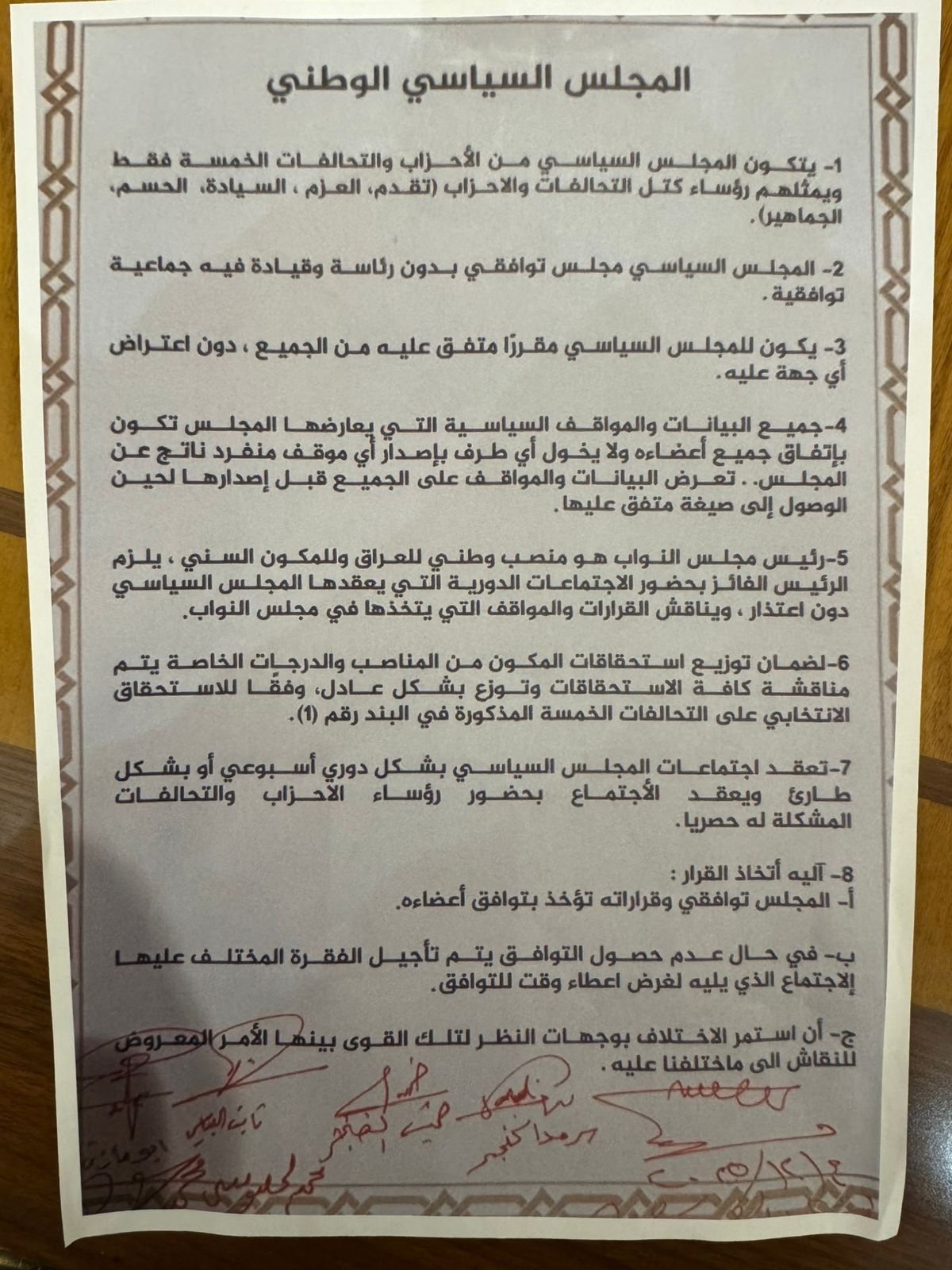 تنشر "بغداد اليوم"، اليوم الاثنين ( 29 كانون الأول 2025 )، نسخة من الاتفاق السياسي الموقّع بين أعضاء المجلس السياسي الوطني، والذي جرى تشكيل المجلس على أساسه، وقد أخلّت به اليوم الاطراف الموقِّعة نفسها، في تجاوز واضح للتعهدات والالتزامات المتفق عليها.