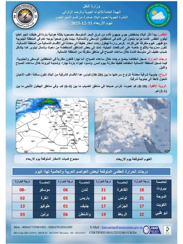 توقعت الأنواء الجوية، اليوم الأربعاء ( 31 كانون الأول 2025 )، تأثر البلاد بمنخفض جوي بارد، يسبب طقساً غائماً في الوسطى والشمالية وصحواً في الجنوبية، مع فرص أمطار شمالاً قد تكون ممزوجة بالثلوج على المرتفعات، وانخفاض درجات الحرارة وأجواء باردة نهاراً وشديدة البرودة ليلاً.