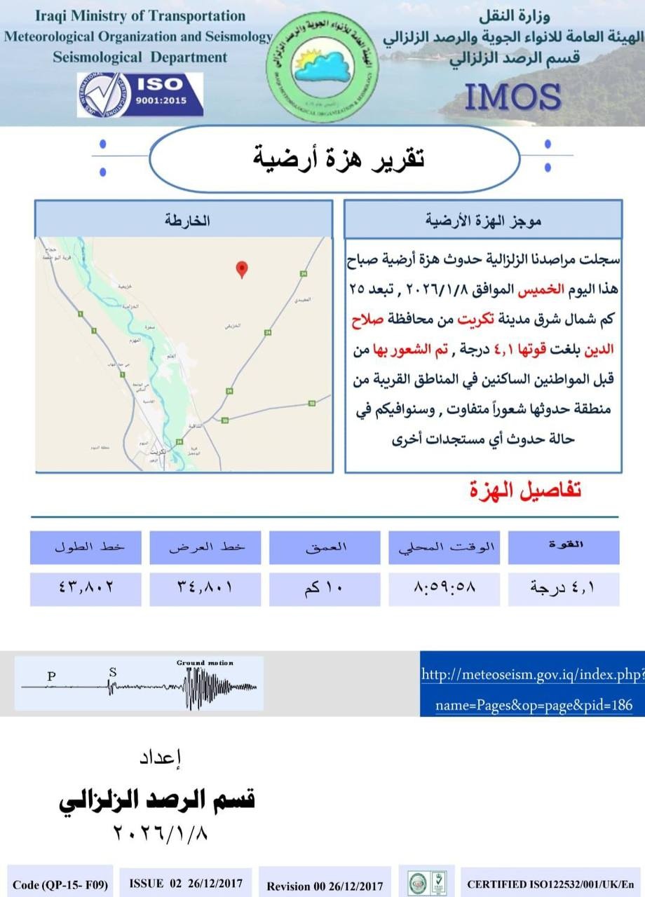 سجلت المراصد الزلزالية في الهيئة العامة للأنواء الجوية والرصد الزلزالي، صباح اليوم الخميس، ( 8 كانون الثاني 2026 )، حدوث هزة أرضية في محافظة صلاح الدين.