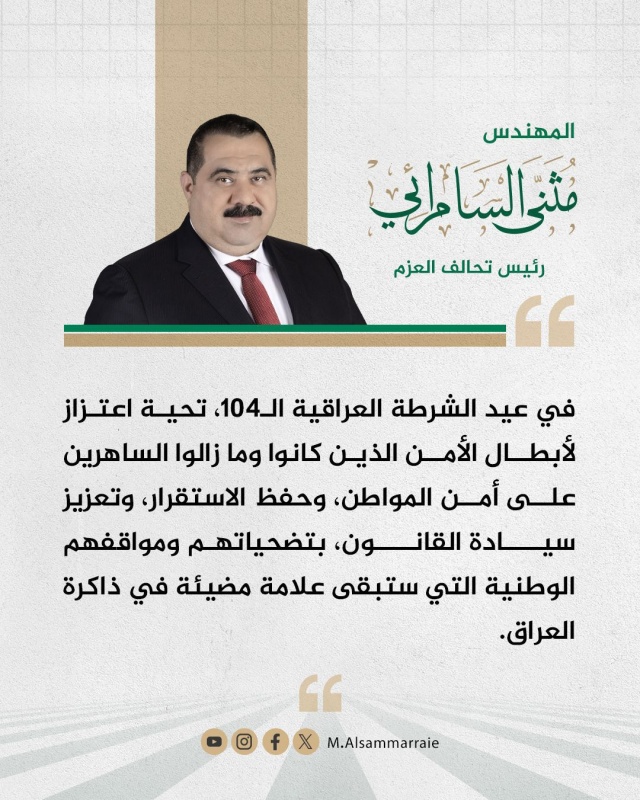 قدّم رئيس تحالف العزم مثنى السامرائي، اليوم الجمعة ( 09 كانون الثاني 2026 )، تهنئته إلى منتسبي وزارة الداخلية والقوّات الساندة بمناسبة الذكرى الـ104 لعيد الشرطة العراقية، موجّهًا تحية اعتزاز لـ"أبطال الأمن الذين كانوا وما زالوا الساهرين على أمن المواطن وحفظ الاستقرار وتعزيز سيادة القانون".