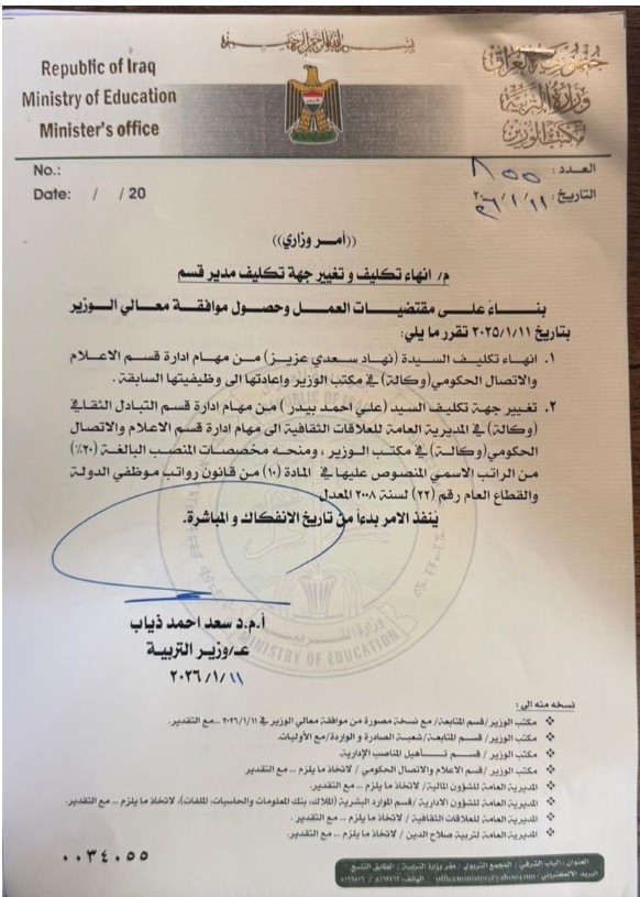 واشارت وثيقة صادرة من الوزارة بتاريخ ( 11 كانون الثاني 2026 ) وحصلت عليها "بغداد اليوم"، الى "تكليف علي أحمد بيدر بدلاً عن نهاد سعدي عزيز، على أن يُنفذ القرار بدءاً من تاريخ المباشرة".