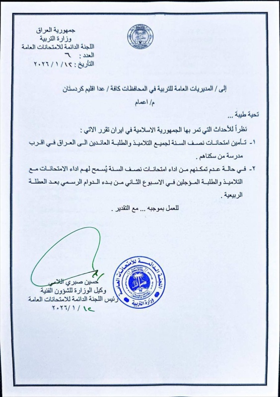 وذكرت الوزارة في بيان تلقته "بغداد اليوم"، أنه "نظراً للأحداث الجارية، وجهت اللجنة الدائمة للامتحانات بتأمين أداء امتحانات نصف السنة لجميع التلاميذ والطلبة العائدين إلى العراق من الجمهورية الإسلامية في إيران، وذلك في أقرب مدرسة إلى محل سكنهم".
