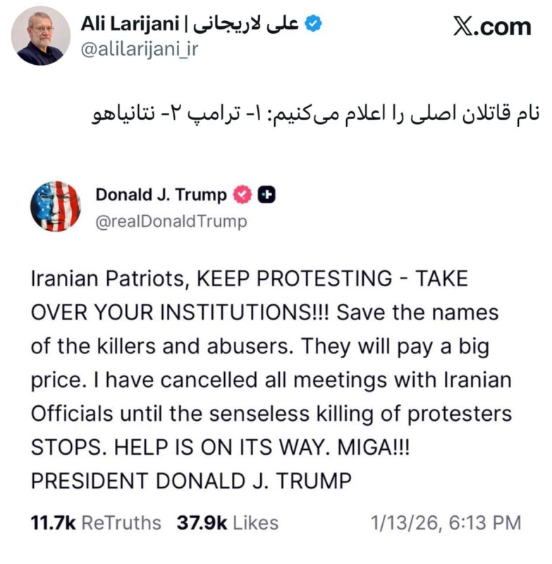 رد رئيس مجلس الأمن القومي الإيراني، علي لاريجاني، اليوم الثلاثاء ( 13 كانون الثاني 2026 )، على تصريحات الرئيس الأمريكي دونالد ترامب التي توعد فيها بملاحقة من وصفهم بـ"القتلة والمعتدين" في الاحتجاجات الإيرانية.