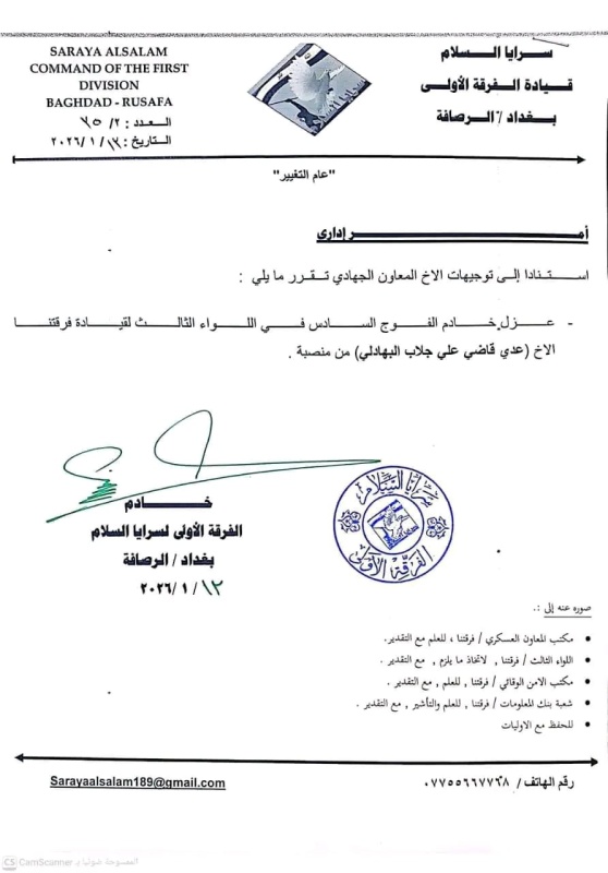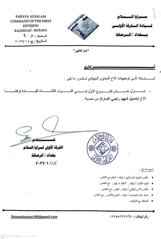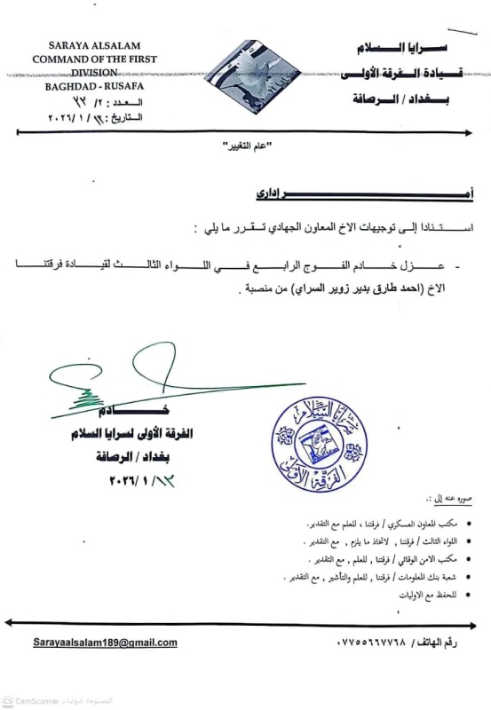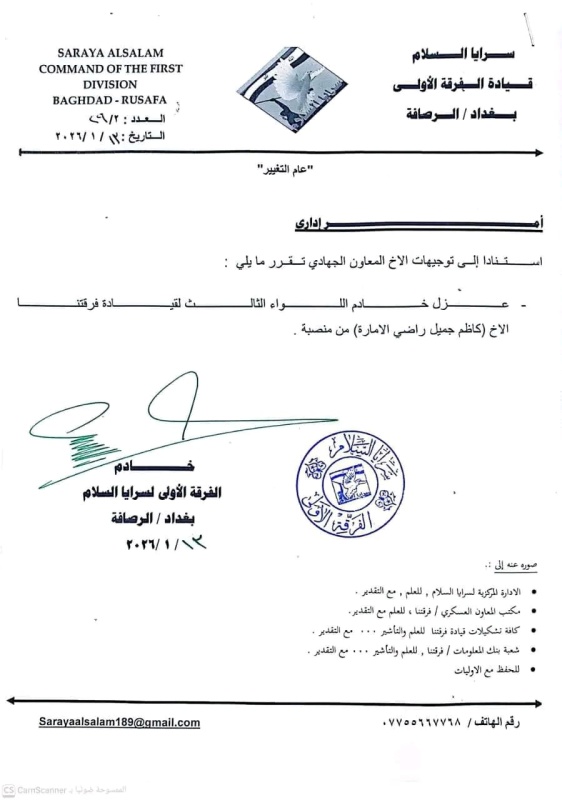 أعلنت سرايا السلام، اليوم الأربعاء ( 14 كانون الثاني 2026 )، عن صدور أوامر عسكرية وإدارية جديدة بحق عدد من خدام التشكيلات ضمن الفرقة الأولى في بغداد / الرصافة، شملت إعفاء خادم اللواء الثالث وعددا من خدام الافواج.