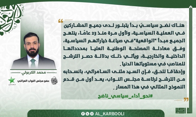 وكتب الكربولي في تغريدة على منصة "أكس" وتابعتها "اليوم اليوم"، "هناك نضح سياسي بدأ يتبلور لدى جميع المشاركين في العملية السياسية، ولأول مرة منذ 23 عاما، ينتهج الجميع مبدأ "الواقعية" في صياغة خياراتهم السياسية، وفق معادلة المصلحة الوطنية العليا بمحدداتها الداخلية والخارجية، ويأتي ذلك بدلالة حصر الترشح للمناصب في مستوياتها الدنيا".