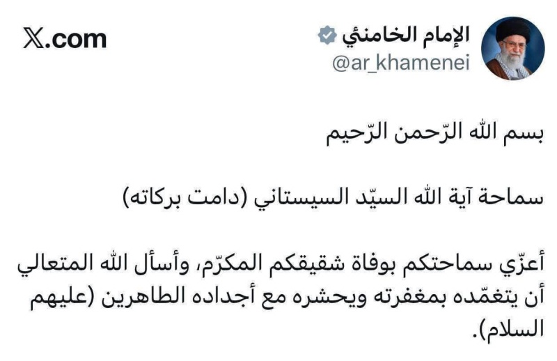 بعث المرشد الإيراني علي خامنئي، اليوم الأحد ( 18 كانون الثاني 2026 )، رسالة تعزية إلى المرجع الديني علي السيستاني، وذلك على إثر وفاة شقيقه هادي السيستاني.