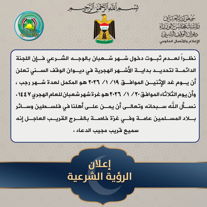 أعلن ديوان الوقف السني، اليوم الأحد، ( 18 كانون الثاني 2026 )، أن يوم الثلاثاء المقبل هو غرة شهر شعبان للعام الهجري 1447.
