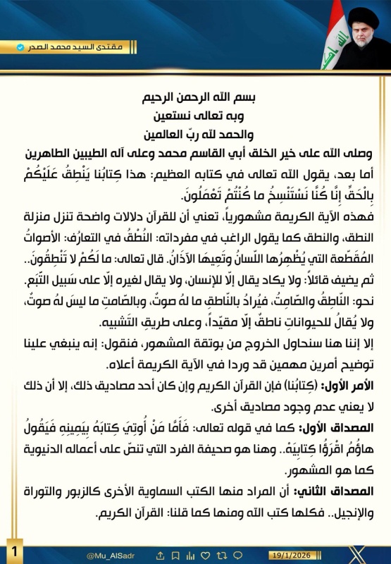 أصدر زعيم التيار الوطني الشيعي، مقتدى الصدر، اليوم الأحد، ( 19 كانون الثاني 2026 )، تغريدة جديدة على صفحته الرسمية بموقع "أكس".