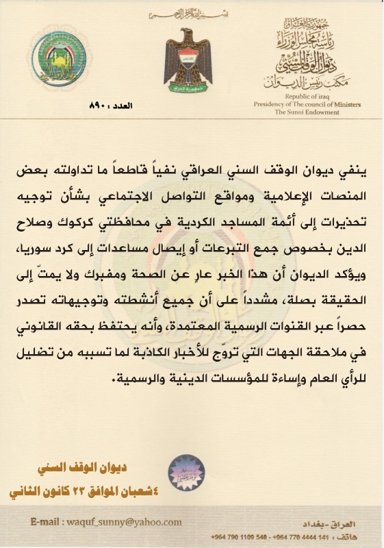 نفى ديوان الوقف السني العراقي، اليوم الجمعة ( 23 كانون الثاني 2026 )، نفياً قاطعاً ما تداولته بعض المنصّات الإعلامية ومواقع التواصل الاجتماعي بشأن توجيه تحذيرات إلى أئمّة المساجد الكردية في محافظتي كركوك وصلاح الدين بخصوص جمع التبرّعات أو إيصال مساعدات إلى كرد سوريا.