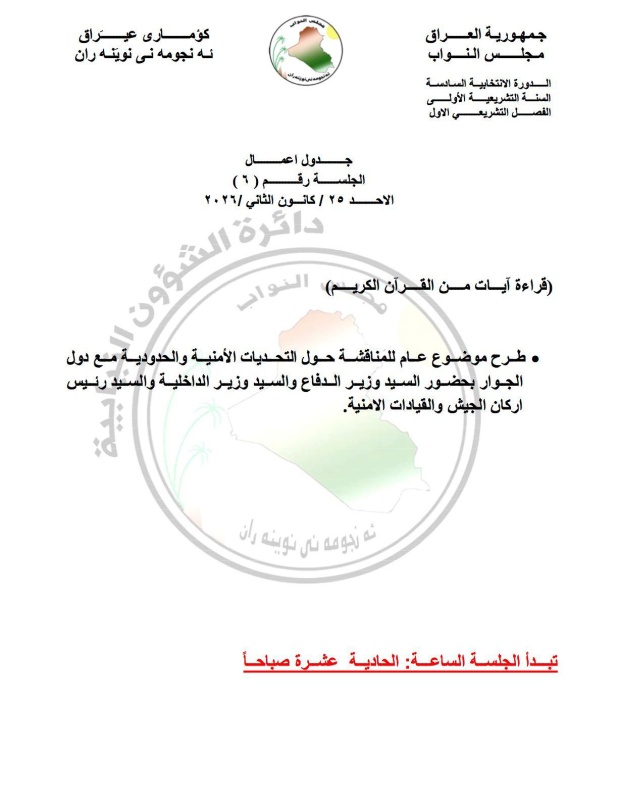 نشر المكتب الإعلامي لمجلس النواب، اليوم الجمعة (23 كانون الثاني 2026)، جدول أعمال جلسة البرلمان.