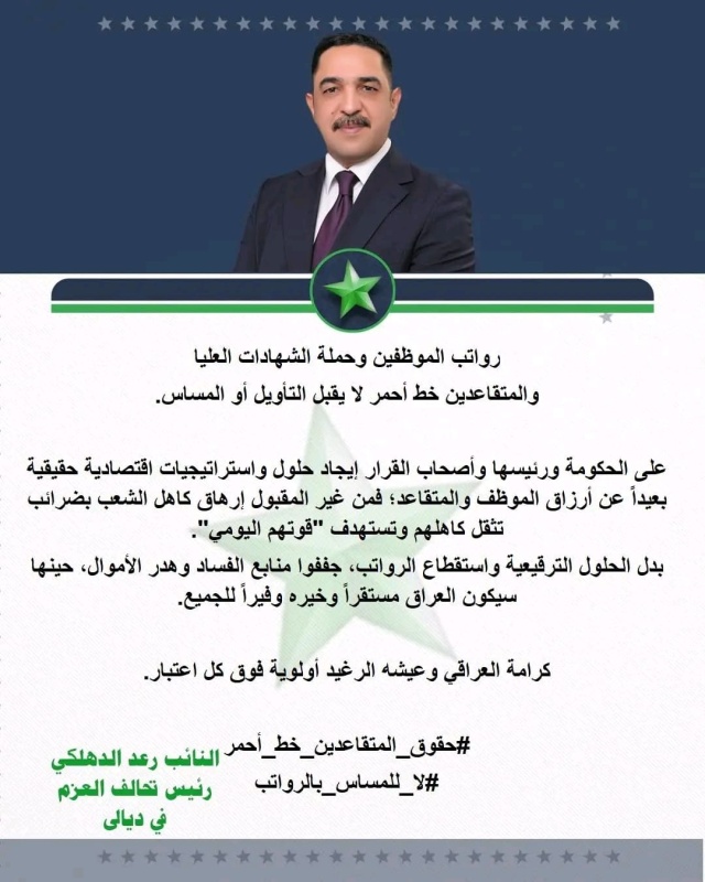أكد النائب رعد الدهلكي، اليوم الجمعة ( 23 كانون الثاني 2026 )، أنّ رواتب الموظفين والمتقاعدين تمثّل خطًا أحمر لا يقبل المساس أو الاقتراب منه تحت أي عنوان مالي أو إصلاحي.