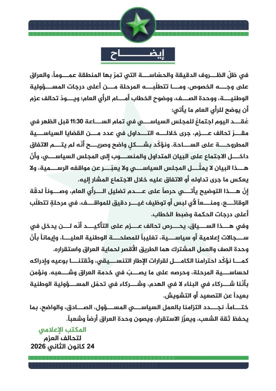 وأشار تحالف العزم إلى "التزامه الكامل باحترام قرارات الإطار التنسيقي، وحرصه على ما يخدم استقرار العراق ووحدة صفّه"، مؤكداً أنّ "مواقفه تُعبَّر عنها حصراً عبر بياناته الرسمية الصادرة عن المكتب الإعلامي".