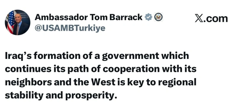 علق المبعوث الأمريكي لسوريا توم باراك، اليوم الاثنين ( 26 كانون الثاني 2026 )، بشأن تشكيل العراق لحكومته.