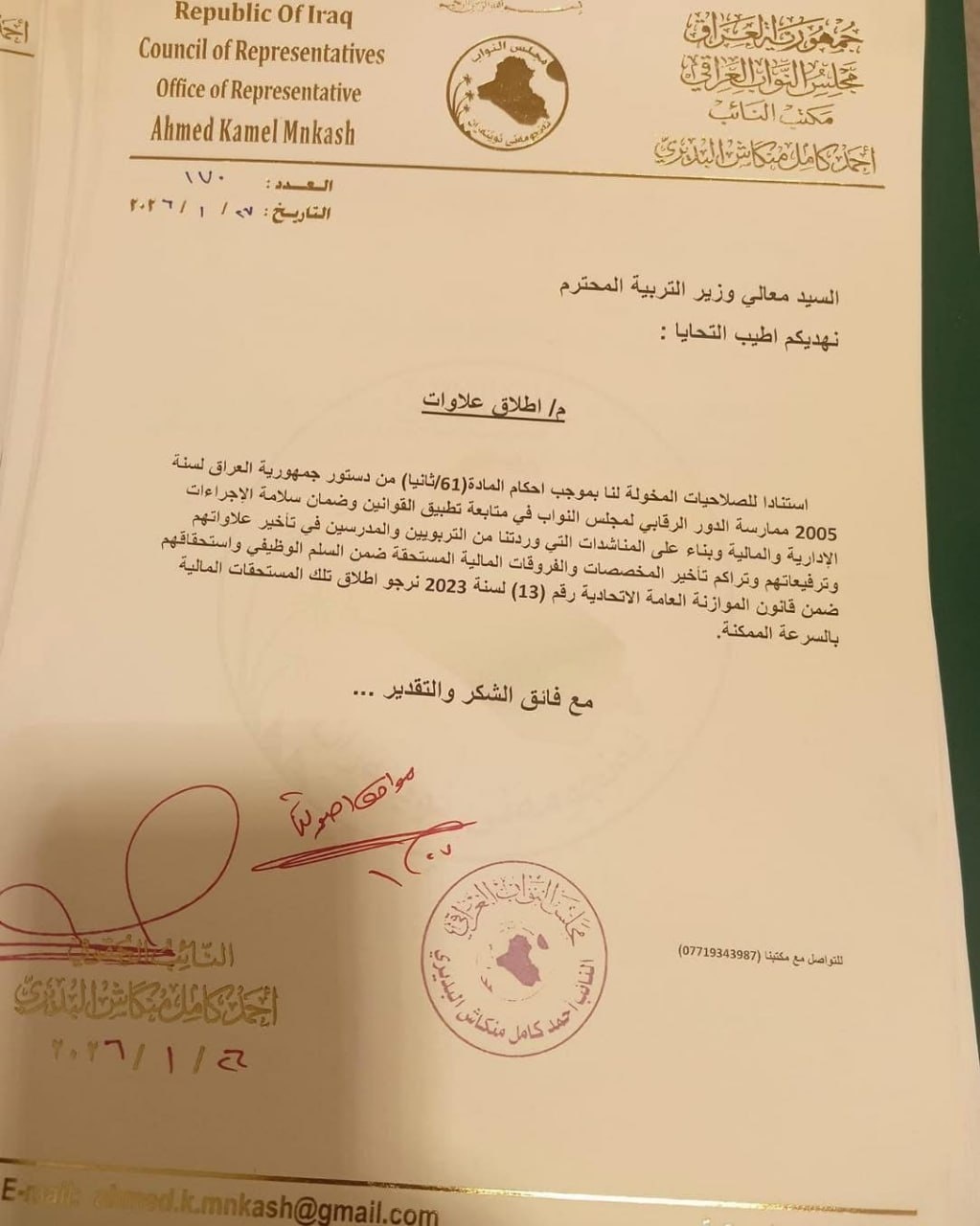 أظهرت وثيقة، صادرة بتاريخ ( 27 كانون الثاني 2026 )، موافقة وزارة التربية على إطلاق العلاوات للكوادر التربوية والتدريسية، والتي تشمل المعلمين والمدرسين، في خطوة تهدف إلى تحسين الأوضاع المالية للعاملين في القطاع التعليمي.