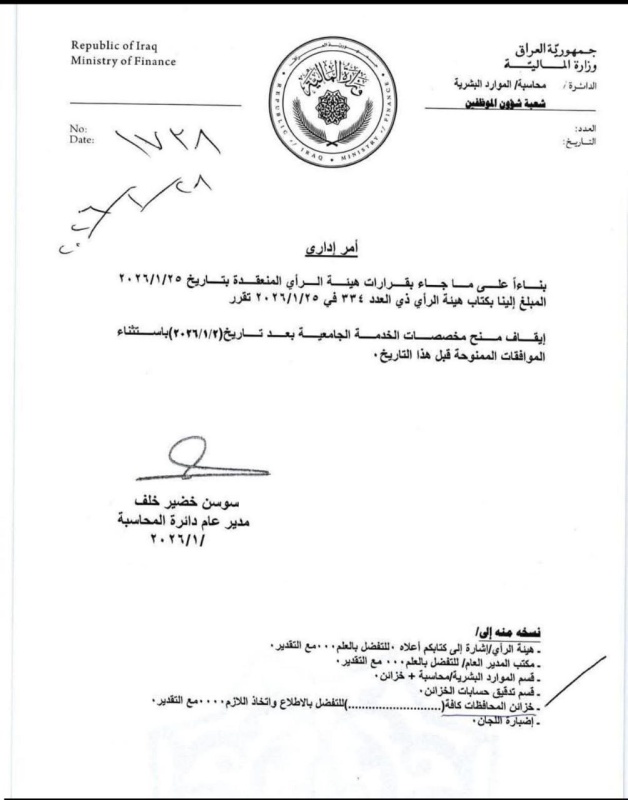 وبحسب وثيقة متداولة، اطلعت عليها "بغداد اليوم"، فان إيقاف منح المخصصات الجامعية يكون بعد تاريخ 2026/1/2 باستثناء الممنوحة قبل هذا التاريخ وتكون مستمرة".