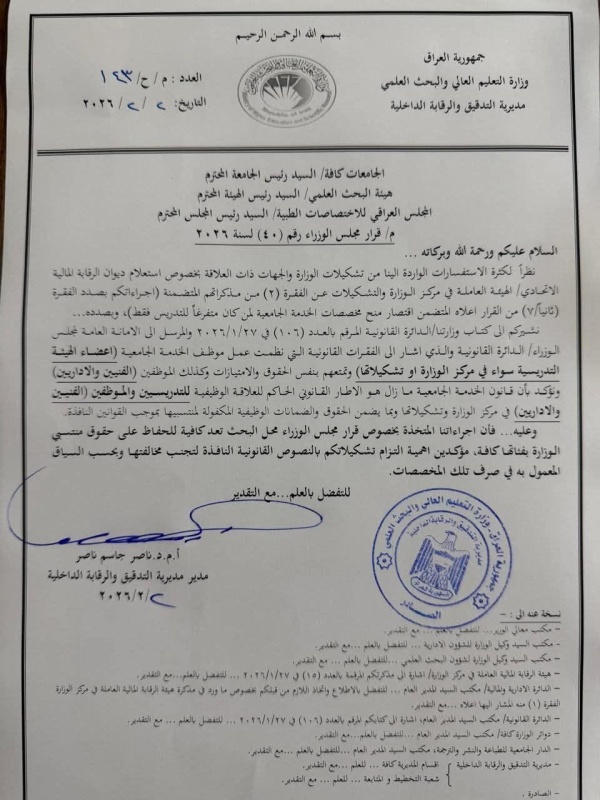 أظهرت وثيقة صادرة عن وزارة التعليم العالي والبحث العلمي، اليوم الاثنين (2 شباط 2026)، أنّه لا يوجد أي استقطاع على رواتب التدريسيين والموظفين التابعين للوزارة.