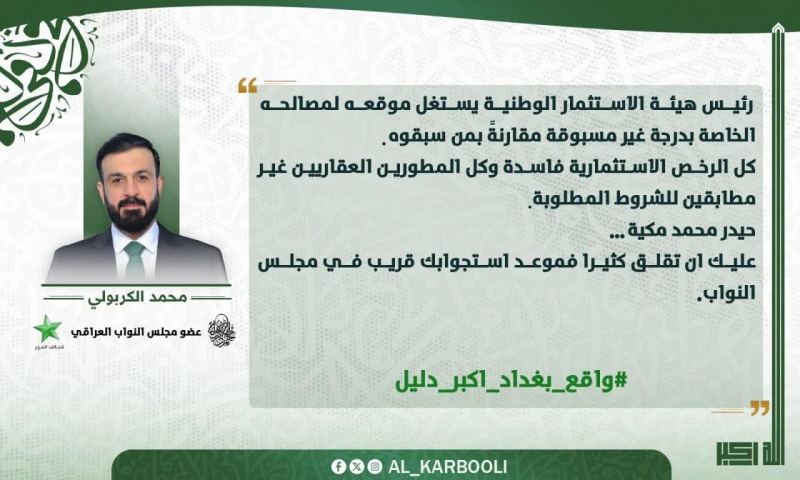 وقال الكربولي في تغريدة على حسابه في منصة (إكس)، إن: "كل الرخص الاستثمارية فاسدة وكل المطورين العقاريين غير مطابقين للشروط المطلوبة، مخاطباً رئيس هيئة الاستثمار حيدر محمد مكية بالقول: "عليك أن تقلق كثيراً فموعد استجوابك قريب في مجلس النواب" حسب قوله.