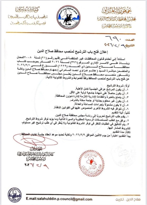 أعلن مجلس محافظة صلاح الدين، اليوم الإثنين ( 9 شباط 2026 )، فتح باب الترشيح لمنصب محافظ المحافظة، وذلك بعد شغور المنصب وتكليف هاشم عزاوي أحمد السامرائي بمهام المحافظ بالوكالة.