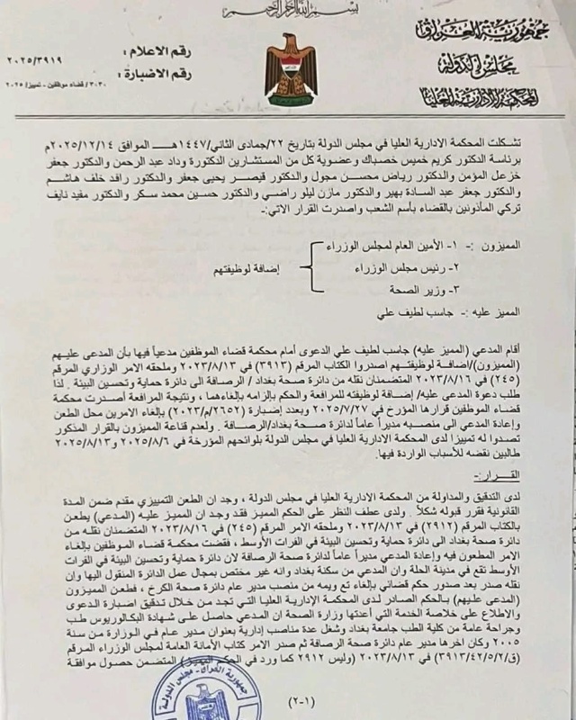 أصدرت المحكمة الإدارية العليا في مجلس الدولة، اليوم الإثنين، ( 9 شباط 2026 )، قراراً يقضي بإعادة جاسب لطيف الحجامي إلى منصبه مديراً عاماً لدائرة صحة بغداد الرصافة، بعد نقض قرارات سابقة بنقله من المنصب الى دائرة حماية وتحسين البيئة.
