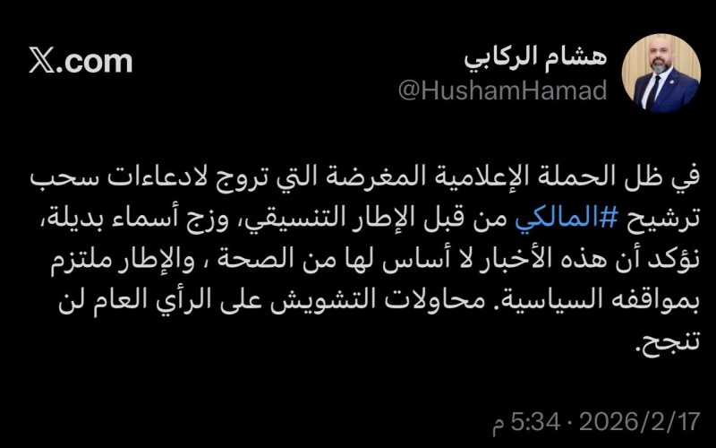 نفى المستشار الإعلامي لرئيس ائتلاف دولة القانون، هشام الركابي، اليوم الثلاثاء، ( 17 شباط 2026 )، الأنباء التي تحدثت عن سحب ترشيح نوري المالكي من قبل الإطار التنسيقي لرئاسة الوزراء.