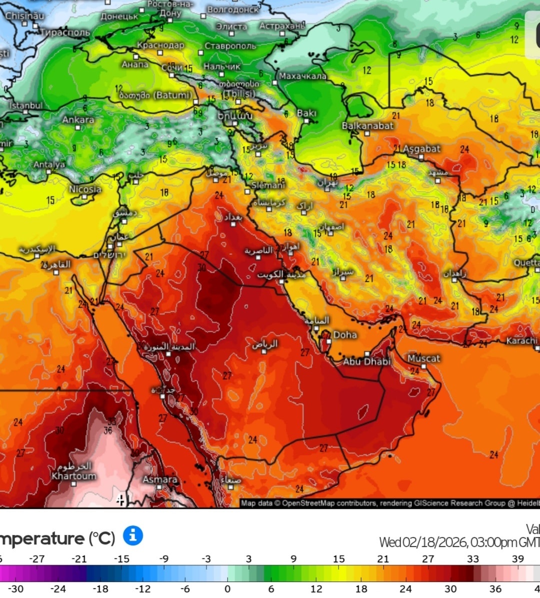-معظم أنحاء الشرق الأوسط وشبه الجزيرة العربية تشهد موجة دفء غير معتادة في هذا التوقيت الذي يعد عادة ذروة موسم الشتاء.