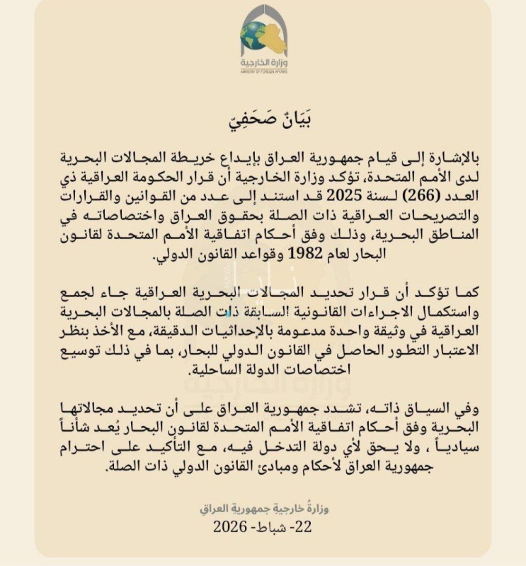 أكدت وزارة الخارجية، اليوم الأحد، ( 22 شباط 2026 )، أن قرار الحكومة العراقية المرقم 266 لسنة 2025 بشأن إيداع خريطة المجالات البحرية لدى الأمم المتحدة استند إلى القوانين والتصريحات الوطنية ذات الصلة بحقوق العراق واختصاصاته في المناطق البحرية.