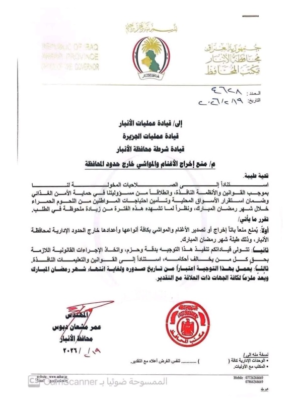 أعلنت محافظة الانبار، منع إخراج الأغنام والمواشي خارج حدودها خلال شهر رمضان، لزيادة الطلب.
