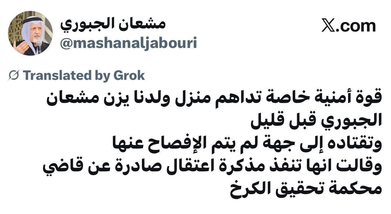 وفي سياق متصل اعلن مشعان الجبوري في تدوينة على حسابه بمنصة "اكس" وتابعتها "بغداد اليوم" بأن "قوة أمنية خاصة داهمت منزل ولدنا يزن مشعان الجبوري، وقالت انها تنفذ مذكرة اعتقال صادرة عن قاضي محكمة تحقيق الكرخ"، مؤكدا أن القوة اقتادته إلى جهة لم يتم الإفصاح عنها".