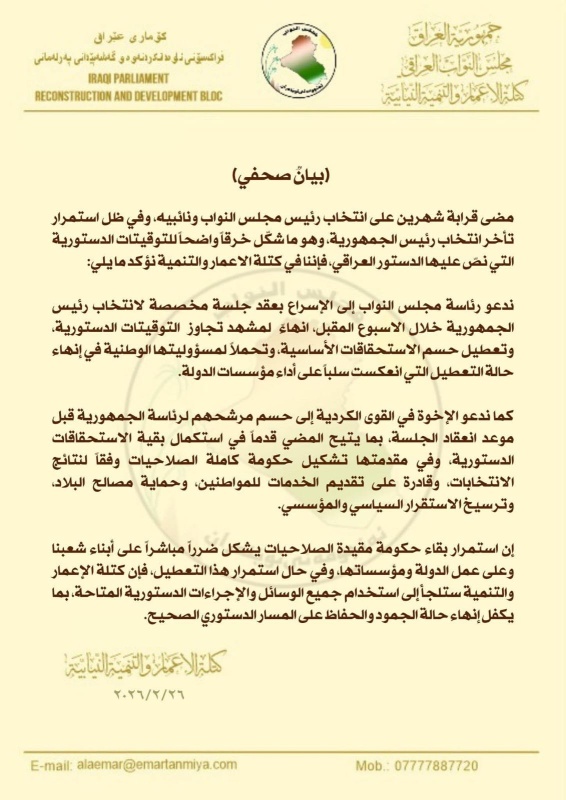 دعت كتلة الإعمار والتنمية النيابية، اليوم الخميس ( 26 شباط 2026 )، إلى الإسراع بإنهاء ملف انتخاب رئيس الجمهورية، محذرةً من استمرار خرق التوقيتات الدستورية وتعطيل استكمال الاستحقاقات الأساسية.