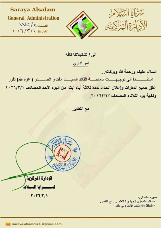 أعلنت الإدارة المركزية لسرايا السلام، اليوم الأحد ( 1 آذار 2026 )، إصدار أمر إداري يقضي بغلق جميع المقرات وإعلان الحداد لمدة ثلاثة أيام، استناداً إلى توجيهات زعيم التيار الصدري مقتدى الصدر.