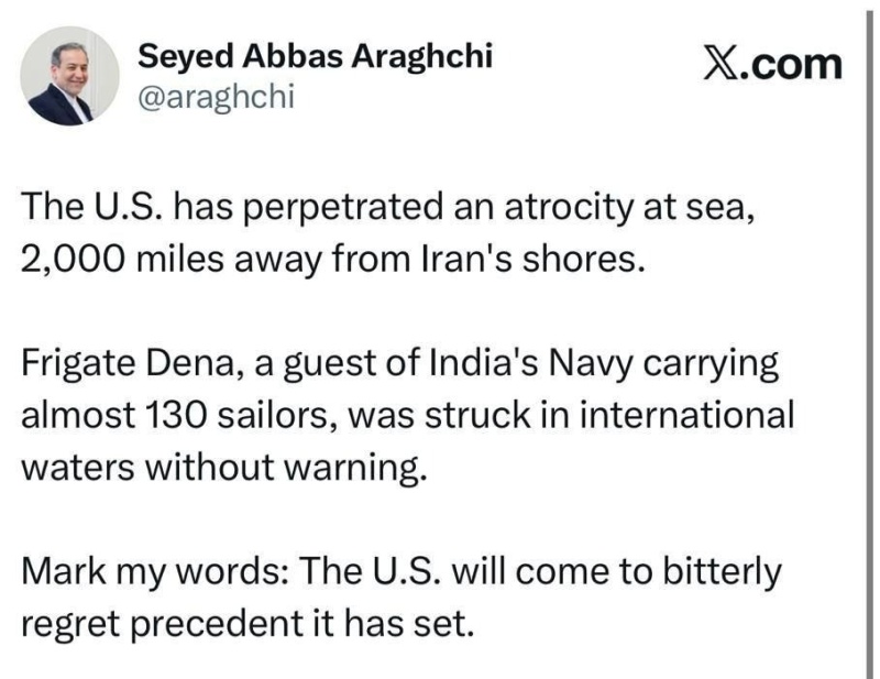 وقال عراقجي بتغريدة على حسابه في منصة "أكس" وتابعتها "بغداد اليوم"، إن "الفرقاطة الإيرانية دينا التي كانت ضيفة على البحرية الهندية تعرضت لهجوم أمريكي في المياه الدولية".