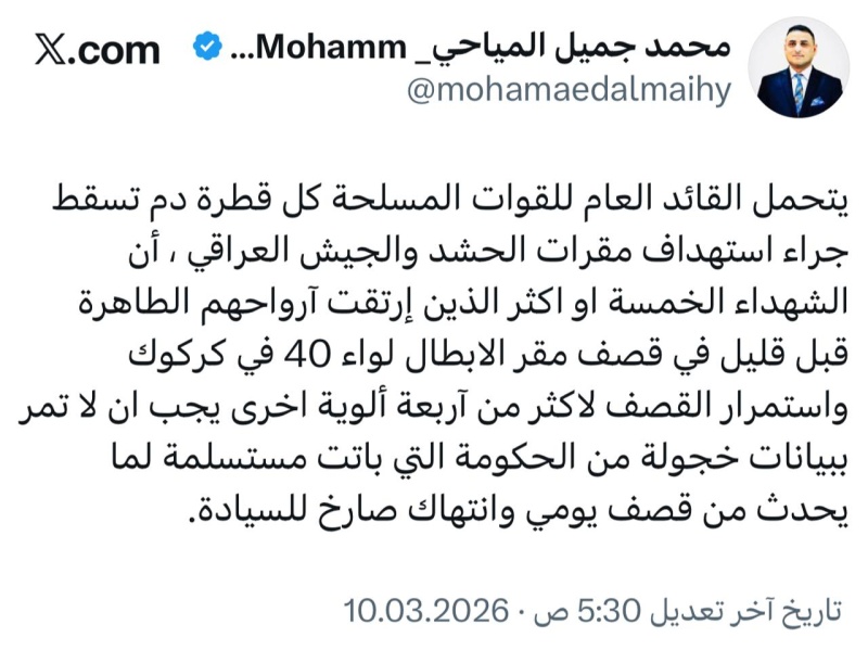 حمّل رئيس كتلة الخدمات النيابية، محمد جميل المياحي، اليوم الثلاثاء ( 10 آذار 2026 )، القائدَ العام للقوات المسلحة ورئيس الوزراء محمد شياع السوداني مسؤولية كل قطرة دم تسقط جراء تكرار استهداف مقرات الجيش وقطعات هيئة الحشد الشعبي، وذلك عقب القصف الذي تعرض له مقر لواء 40 في محافظة كركوك، وأسفر عن سقوط خمسة شهداء أو أكثر.