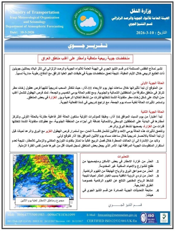 أعلنت هيئة الأنواء الجوية والرصد الزلزالي، اليوم الثلاثاء، ( 10 اذار 2026 )، عن تأثر البلاد بحالتين جويتين متعاقبتين تبدآن من يوم غد الأربعاء وتستمران حتى منتصف الأسبوع المقبل، فيما حذرت من غزيرة الأمطار ونشاط الرياح.