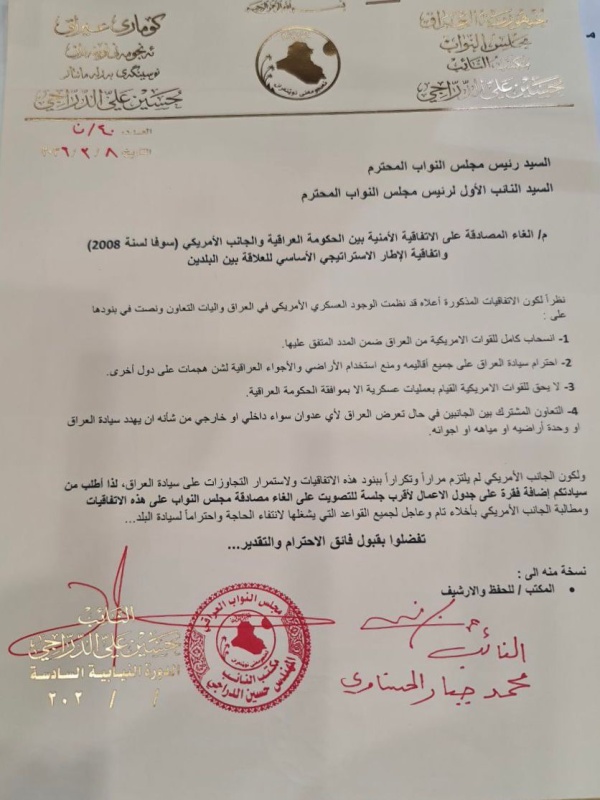 أعلنت النائب سوزان السعد، اليوم الاربعاء ( 11 آذار 2026 ) تقديم دعوة رسمية مدعومة بتواقيع نيابية للمطالبة بإلغاء المصادقة على الاتفاقية الأمنية واتفاقية الإطار الاستراتيجي الموقعة مع الجانب الامريكي عام 2008.