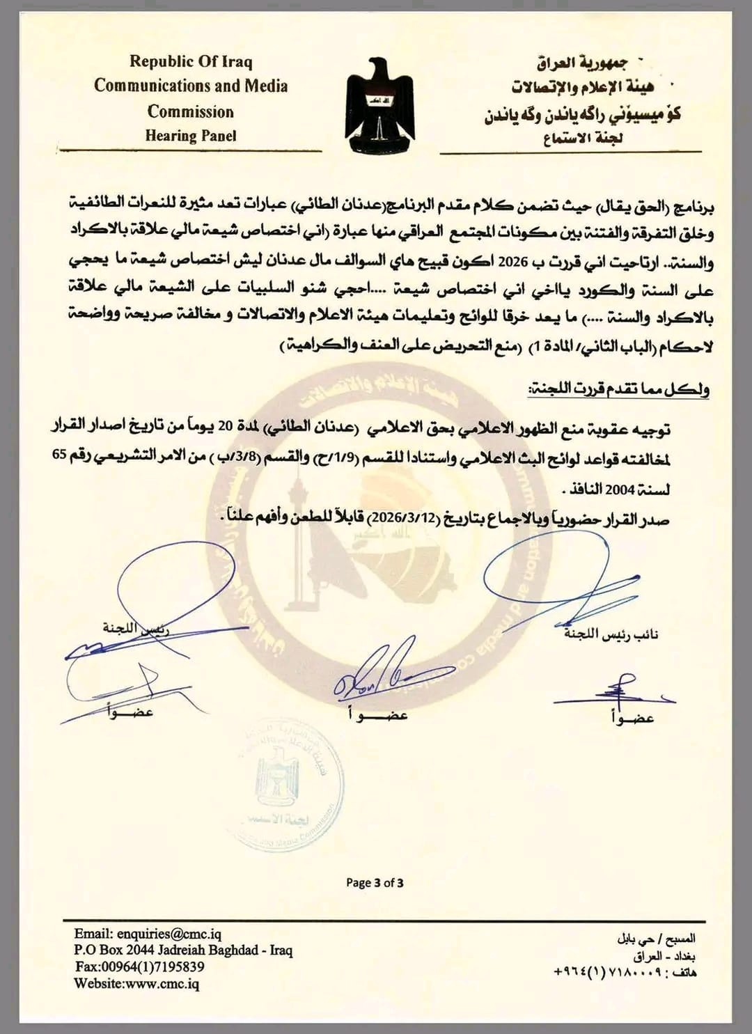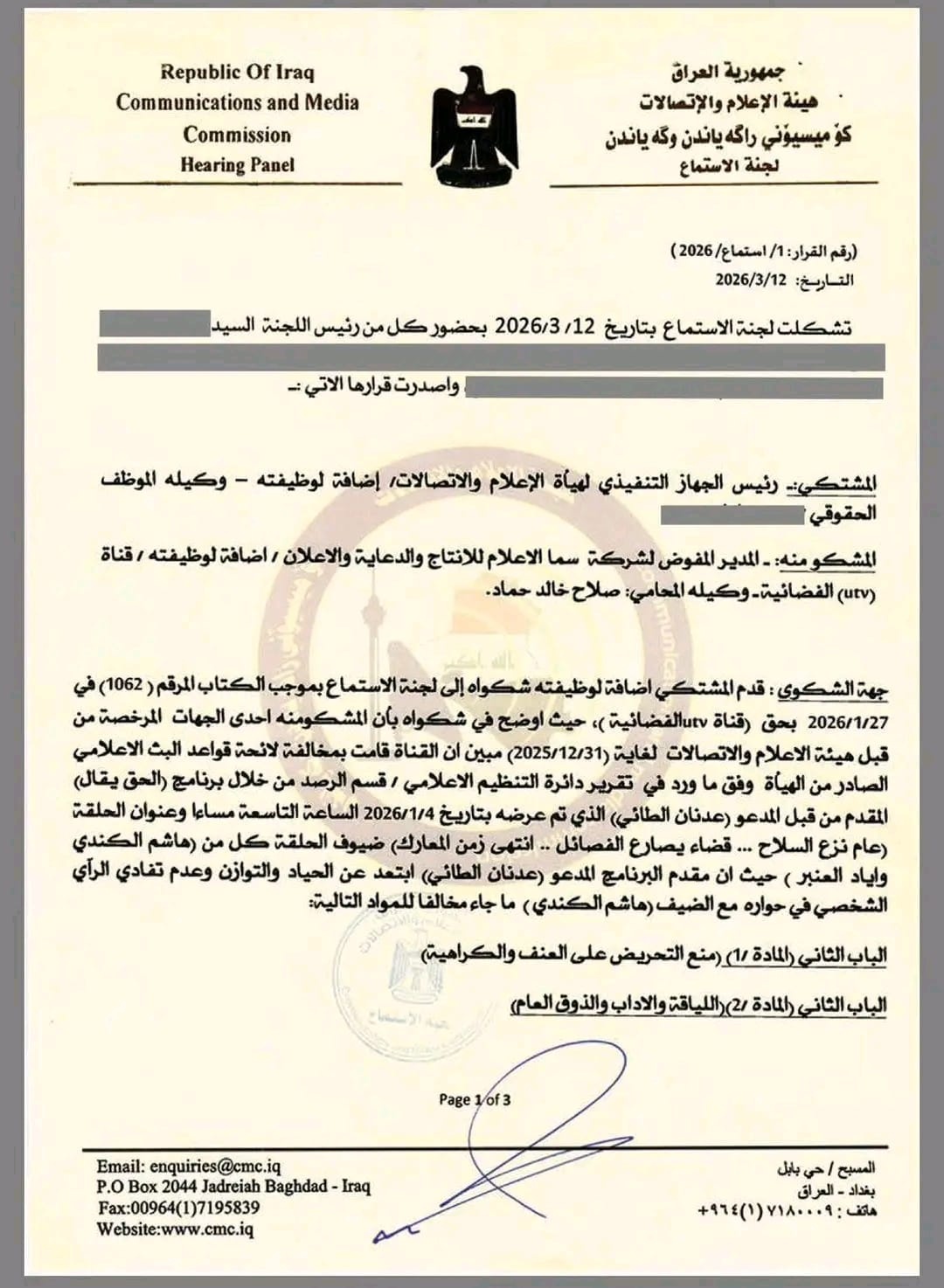 وبحسب وثيقة اطلعت عليها "بغداد اليوم"، فإن "الهيئة أصدرت قراراً رسمياً يوم الخميس المصادف ( 12 آذار 2026 )، يقضي بمعاقبة مقدم برنامج "الحق يقال" الذي يعرض على شاشة قناة UTV الفضائية، وذلك استناداً إلى لوائح وقواعد البث الإعلامي النافذة.