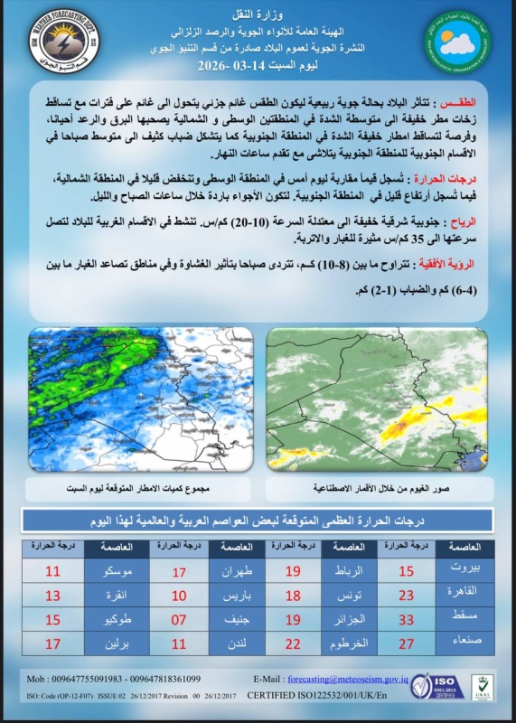 توقعت الهيئة العامة للأنواء الجوية والرصد الزلزالي، اليوم السبت ( 14 آذار 2026 )، طقساً غائماً جزئياً يتحول إلى غائم أحياناً مع زخات مطر خفيفة إلى متوسطة في الوسط والشمال، وفرصة لهطول أمطار خفيفة جنوباً، مشيرة إلى تشكّل ضباب صباحاً في جنوب البلاد يتلاشى لاحقاً، مع درجات حرارة مقاربة في الوسط، وانخفاض طفيف شمالاً وارتفاع بسيط جنوباً، وأجواء باردة نسبياً صباحاً وليلاً.