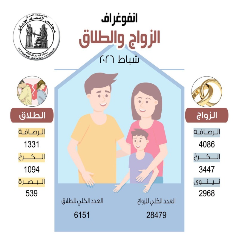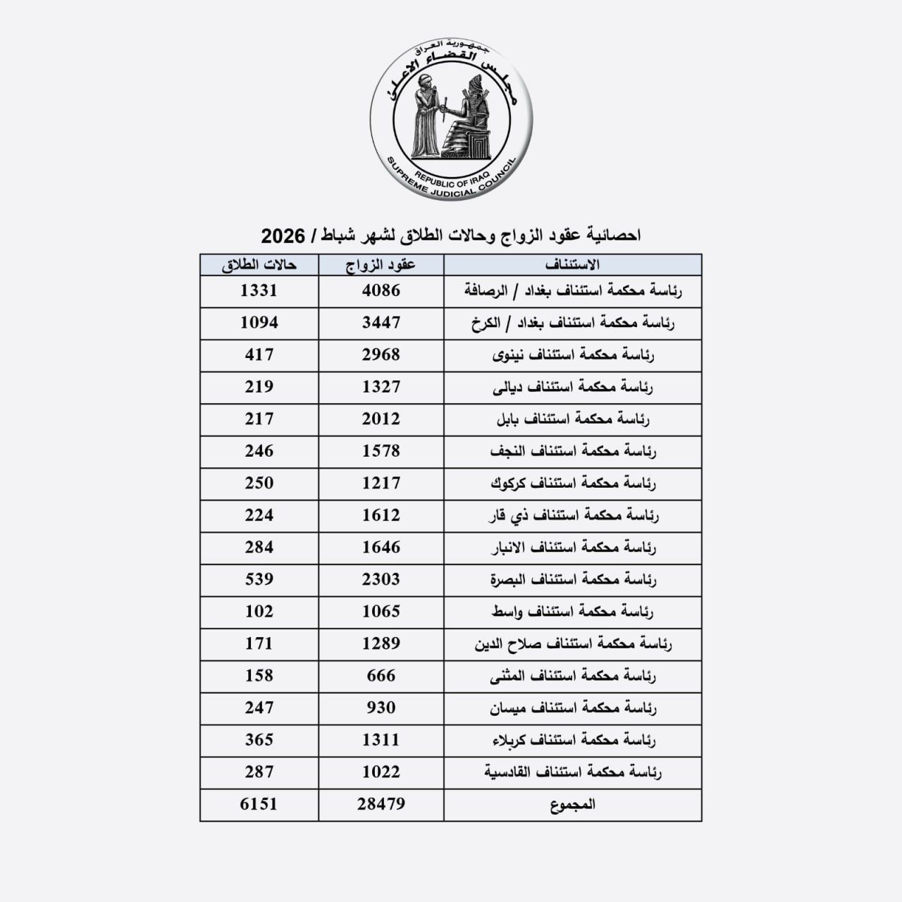 بغداد اليوم - بغداد أعلن مجلس القضاء الاعلى، اليوم الاحد ( 15 آذار 2026 )، عدد حالات الزواج والطلاق في البلاد خلال شهر شباط المنصرم.