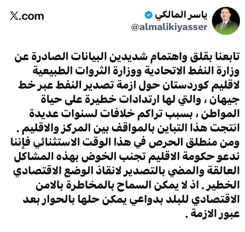 وكتب المالكي تغريدة على منصة "إكس" وتابعتها "بغداد اليوم": "تابعنا بقلق واهتمام شديدين البيانات الصادرة عن وزارة النفط الاتحادية ووزارة الثروات الطبيعية لاقلیم کوردستان حول ازمة تصدير النفط عبر خط جيهان، والتي لها ارتدادات خطيرة على حياة المواطن ، بسبب تراكم خلافات لسنوات عديدة انتجت هذا التباين بالمواقف بين المركز والاقليم".