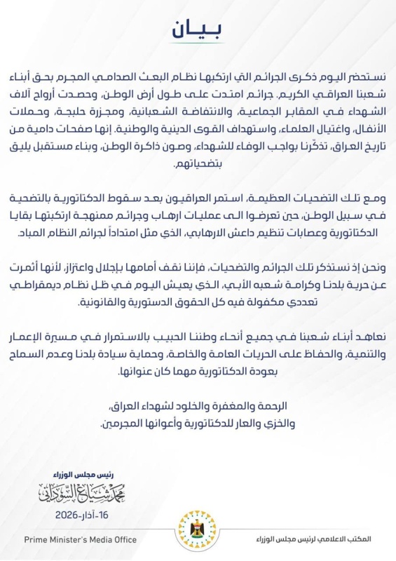 وقال السوداني في بيان بمناسبة ذكرى مجزرة حلبجة، وتلقته "بغداد اليوم"، : "نستحضر اليوم ذكرى الجرائم التي ارتكبها نظام البعث الصدامي المجرم بحق أبناء شعبنا العراقي الكريم. جرائم امتدت على طول أرض الوطن، وحصدت أرواح آلاف الشهداء في المقابر الجماعية، والانتفاضة الشعبانية، ومجزرة حلبجة، وحملات الأنفال، واغتيال العلماء، واستهداف القوى الدينية والوطنية. إنها صفحات دامية من تاريخ العراق، تذكّرنا بواجب الوفاء للشهداء، وصون ذاكرة الوطن، وبناء مستقبل يليق بتضحياتهم".