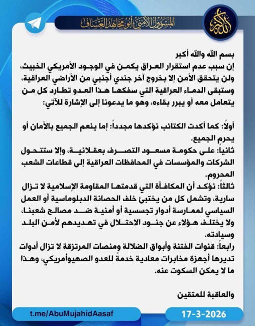 حمل ما يعرف بـ"المسؤول الأمني لكتائب حزب الله"، "أبو مجاهد العساف"، اليوم الثلاثاء ( 17 أذار 2026 )، الوجود العسكري الأمريكي في العراق مسؤولية استمرار حالة عدم الاستقرار الأمني، مؤكدا أن تحقيق الأمن في البلاد لن يكون ممكنا إلا بخروج آخر جندي أجنبي من العراق.