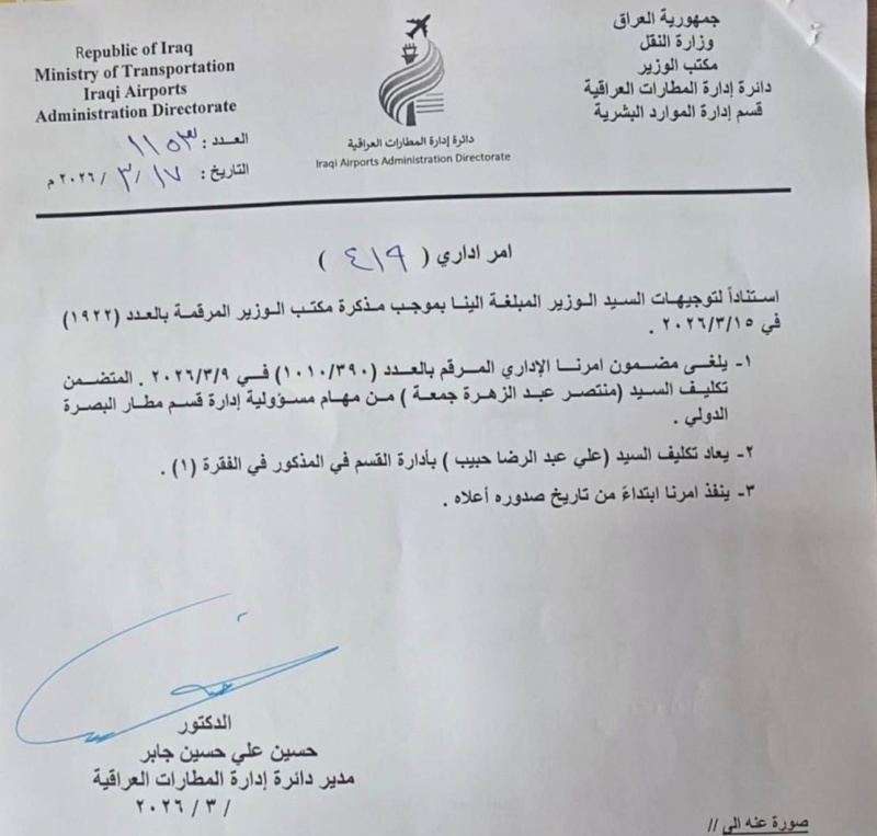 وبحسب الوثيقة، التي اطلعت عليها "بغداد اليوم"، فإن دائرة إدارة المطارات العراقية قررت، يوم الثلاثاء الموافق 17 آذار 2026، إعادة تكليف عبد الرضا بالمنصب، وذلك بعد فترة من إعفائه في وقت سابق.