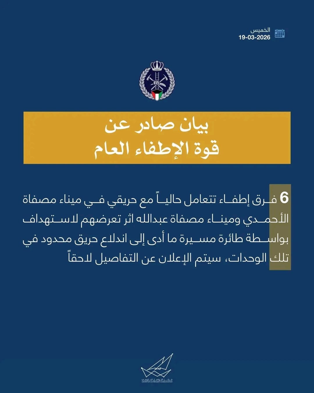 أعلنت مؤسسة البترول الكويتية، اليوم الخميس ( 19 آذار 2026 )، إندلاع حريق في مصفاتي ميناءي الأحمدي وعبد الله بعد تعرضهما لهجوم بطائرات مسيرة.