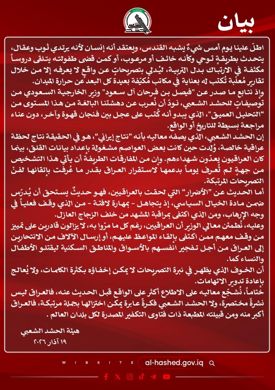 أصدرت هيئة الحشد الشعبي، اليوم الخميس، ( 19 اذار 2026 )، بياناً ردت فيه على التصريحات الأخيرة لوزير الخارجية السعودي فيصل بن فرحان آل سعود بشأن الحشد الشعبي والوضع في العراق.